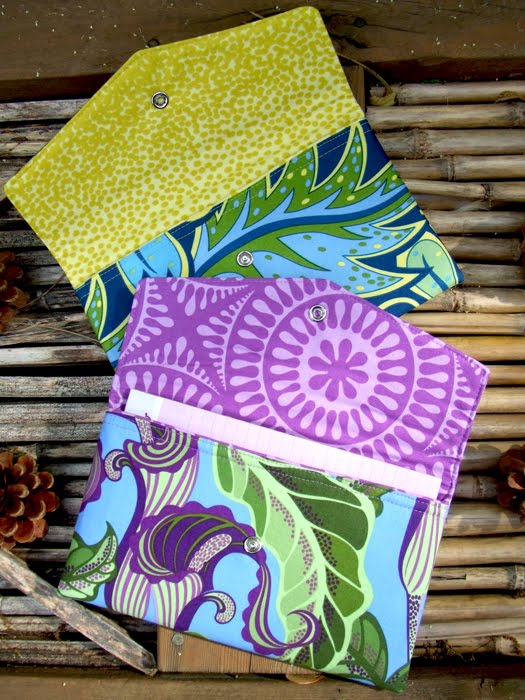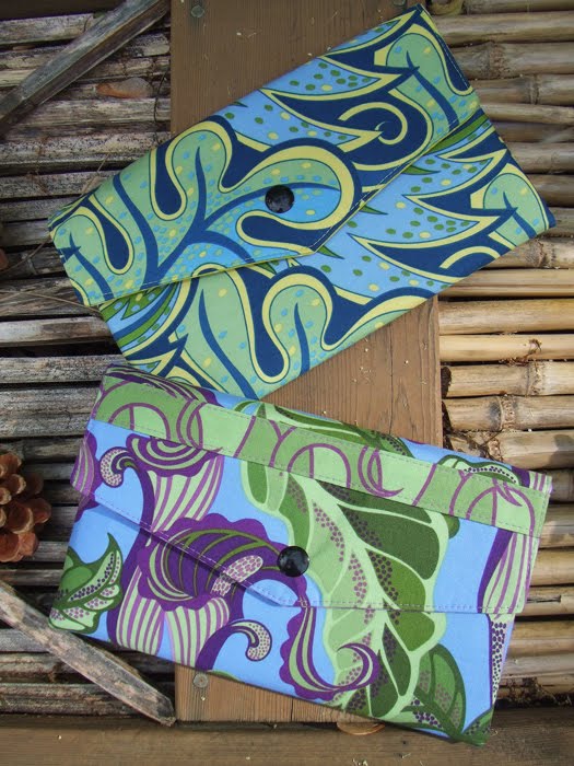 Here are two new clutch bags designed and made by Melissa of 100 Billion Stars, using a vintage Sassaman fabric and the “Jack”design from the current Sunshine and Shadow line. They are sturdy enough to carry a note pad, your check book and credit cards. I like the way she matched the design of the Jack-in-the-Pulpit on the front flap.
