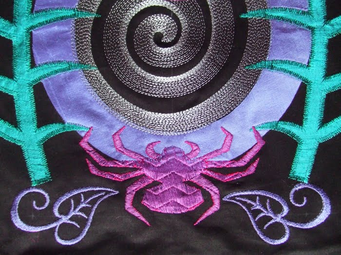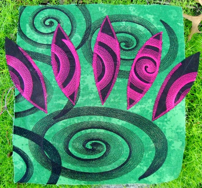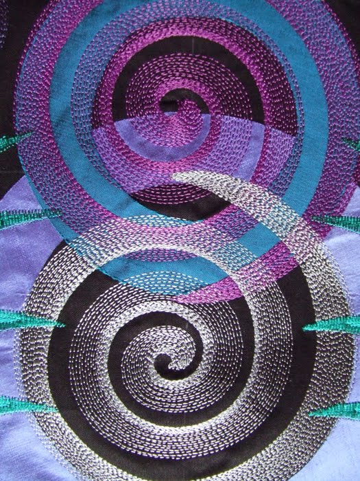 In this case, I used the spiral design, which I altered directly in my 730 Bernina. Then I stitched out several spirals by rehooping a few times. I also tried some different kinds of threads. The leaves were cut from another embroidered piece. Each layer of the quilt became more exciting. The fabric, the surface and the texture can all be enhanced by this extra thread work. My head is reeling with all the possibilities!
