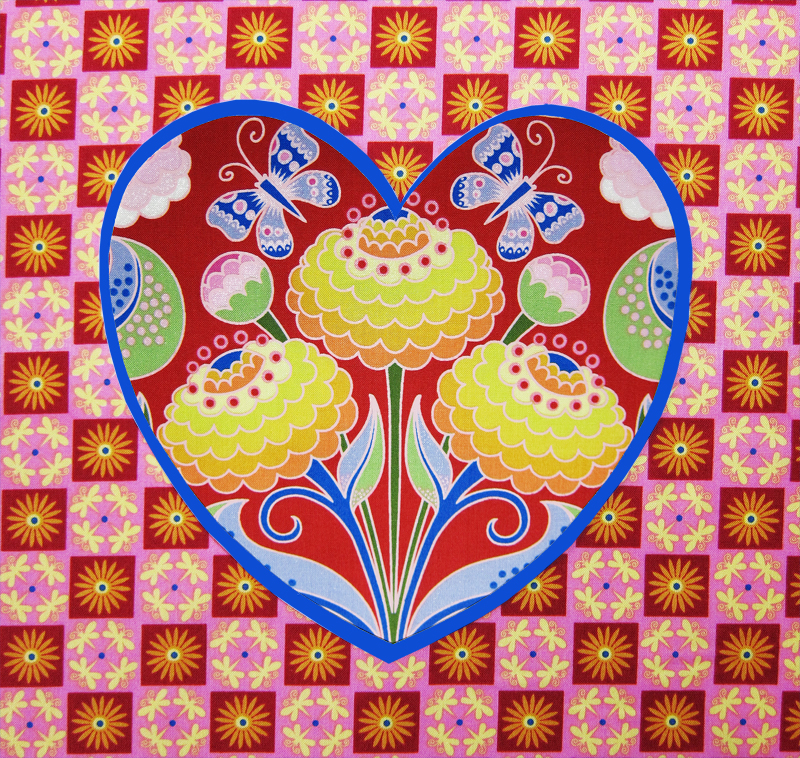 So I decided to play with the heart motif and my current line of fabric, Garden Divas. Each heart is placed on one of the Daisy Check fabrics, since checks are a classic design for children’s clothing and suggests innocence and joy.