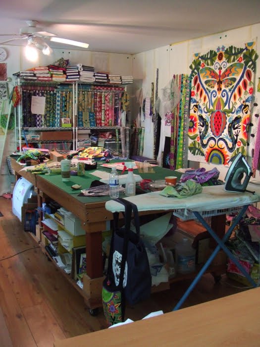 There have been some family distractions, plus I am waiting for some new digitized designs which I want to add to the black border of my new quilt. So since I was in a waiting zone, I used several days to clean up and reorganize the studio. I know it still looks messy in the photo, but believe me it’s a major improvement. You can actually see the worktable’s surface!