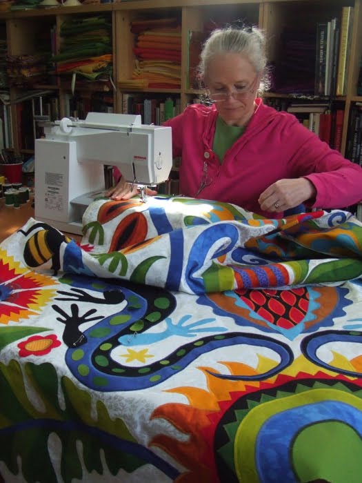 Here is a detail of the quilting done by my friend, Audrey Esarey in Louisville, Kentucky. She used a clear top thread which doesn’t compete for attention, but adds some nice texture and movement. It also helps to blend the kaleidoscopic elements together.